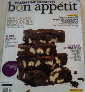 I baked the brownie recipe out of my Bon Apetit magazine and although mine were yummy, I don’t know how they got theirs into such perfect squares for the magazine cover photo shoot, haha.